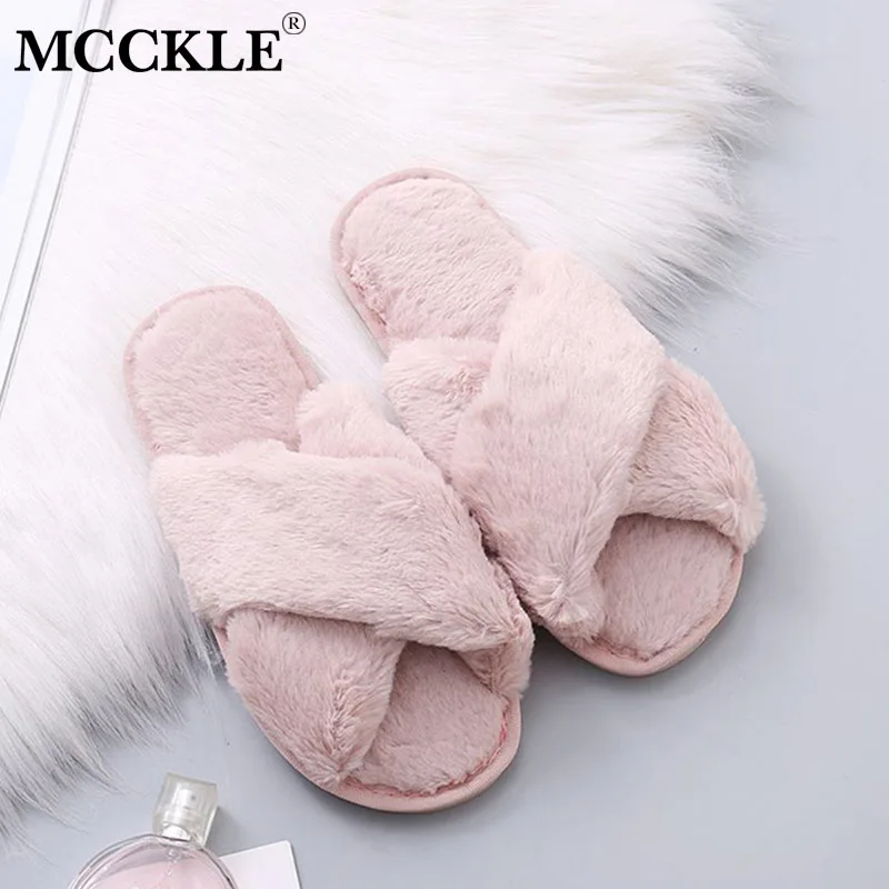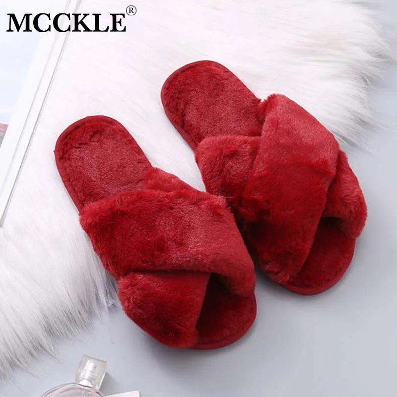 Best Price MCCKLE Winter Home Shoes Women House Slippers Warm Faux Fur Ladies Cross Soft Plush Furry Female Op
