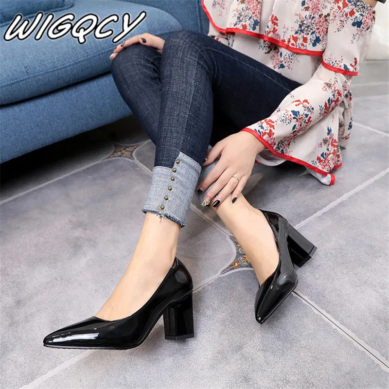 2018 New Women Pumps Black High heels 7.5cm Lady Patent leather Thick with Autumn Pointed Single Shoes Female Sandals Big 33-43 :Click Here