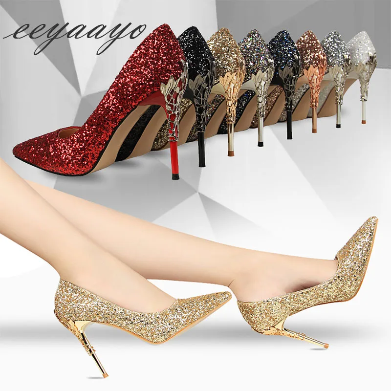 Buy Online 2019 New Spring Women Pumps High Thin Heels Pointed Toe Metal Decoration Sexy Bling Bridal Wedding