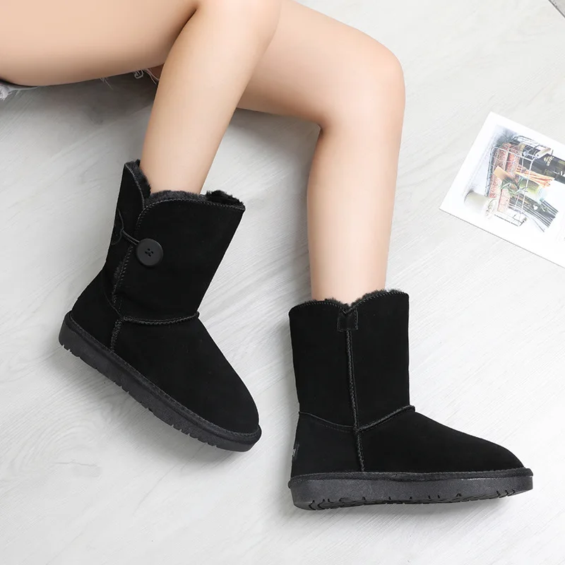 Sale Leather snow boots female 2019 winter new tube wooden button thickening warm waterproof snow cotton