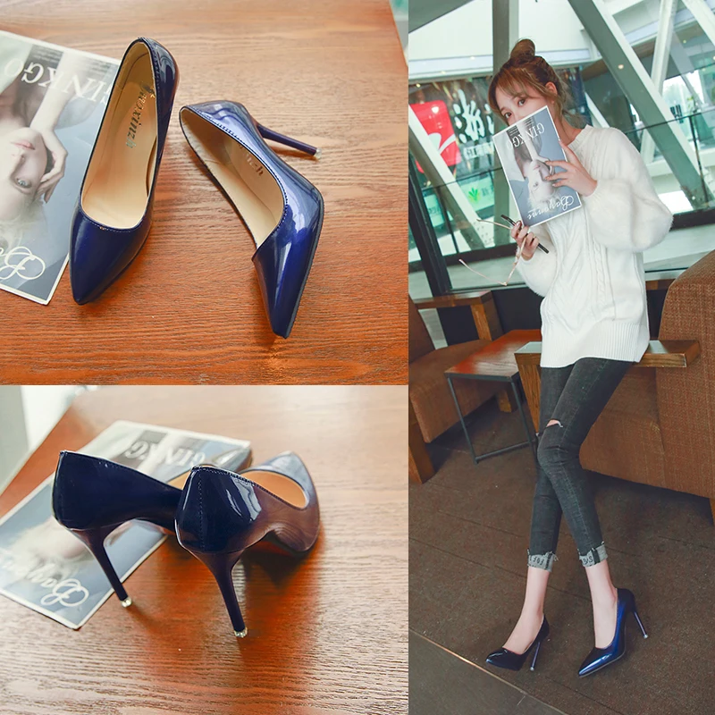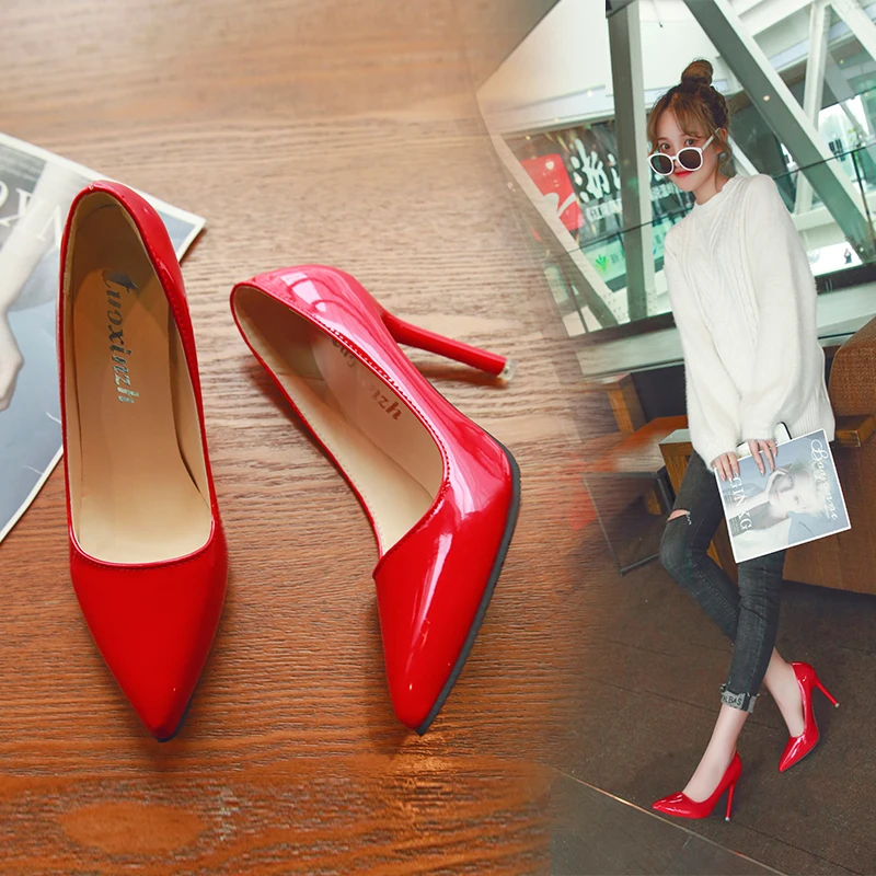 Nude Color Small Fresh High Heels Patent Leather Stiletto Single Shoes Korean Sexy Pointed Pumps Black Professional Work Shoes :Click Here